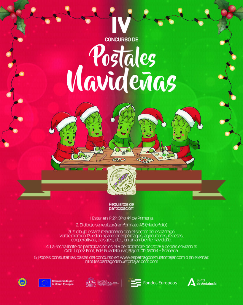Bases del concurso de postales navideñas 2025 octubre 10, 2025 igpesparragowp Noticias Requisitos de participación: Estar en 1º,2º, 3º o 4º de Primaria. El dibujo se realizará en formato A5 (Medio folio). El dibujo estará relacionado con el sector del esparrago verde morado, puede parecer espárragos, agricultores, recetas, Cooperativas, paisajes, ., en un ambiente navideño. […]